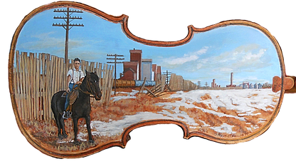 The image used for the background on the back of the violin is of rural Saskatchewan Canada and the picture of Oscar on his horse was taken near Hilda, Alberta Canada. All photos were the personal property of the client.